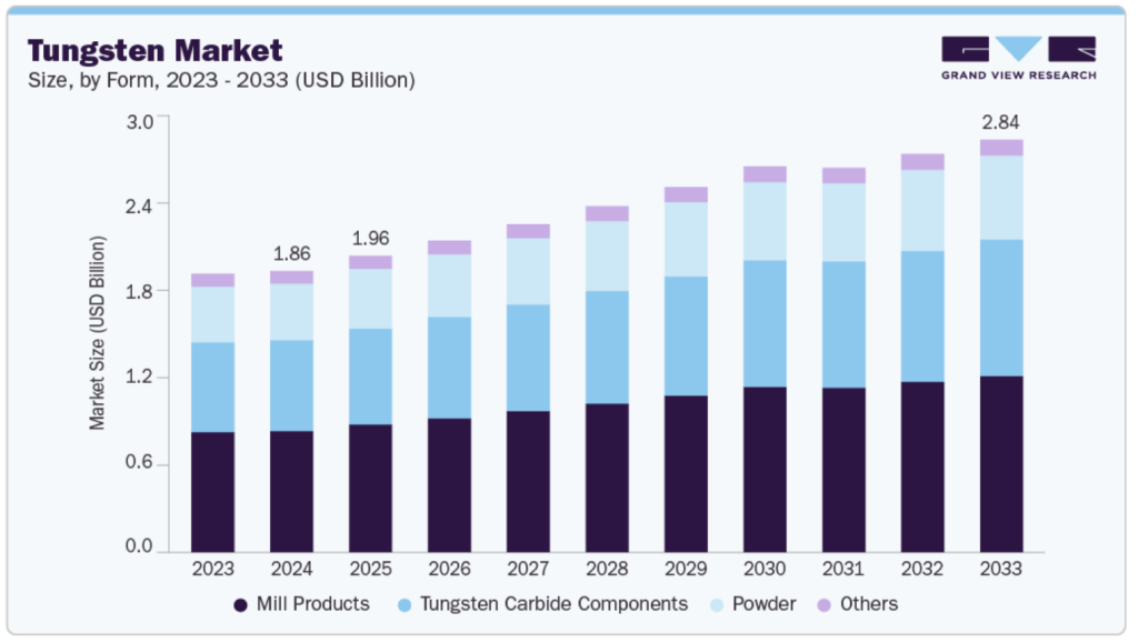 Recent market estimates vary: 2024 market figures reported across reputable sources range (methodology dependent) — some reports estimate around ~1.9 billion USD (specialized tungsten market) while others that include broader downstream products put figures in the ~5–6+ billion USD range; forecasts for 2025 show continued growth (CAGR commonly estimated between ~4% and 8%).